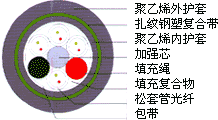 產(chǎn)品型號: GYSTY53也叫(GYTY53) 光纖松套 纜芯填充油膏 金屬中芯加強PE內(nèi)護套 雙面涂塑軋紋鋼帶粘結(jié)PE外護套 | ||||
